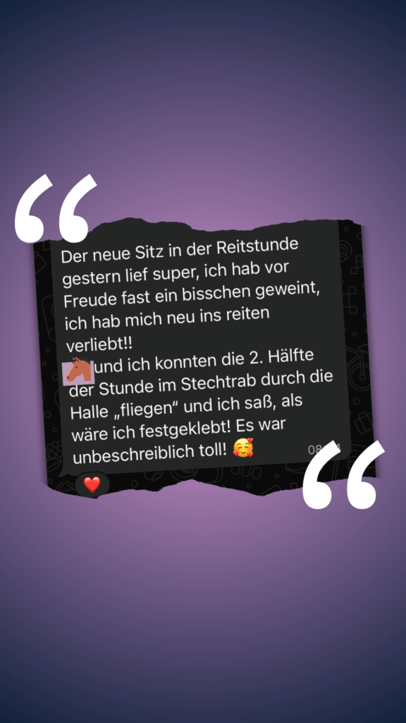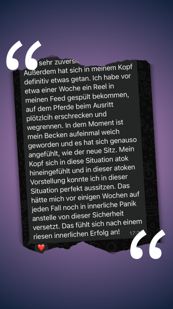 Meine Kundinnen gewinnen damit zum ersten Mal echtes Vertrauen in sich selbst zurück – und können sich dann Stück für Stück steigern – bis sie wieder reiten wie früher.